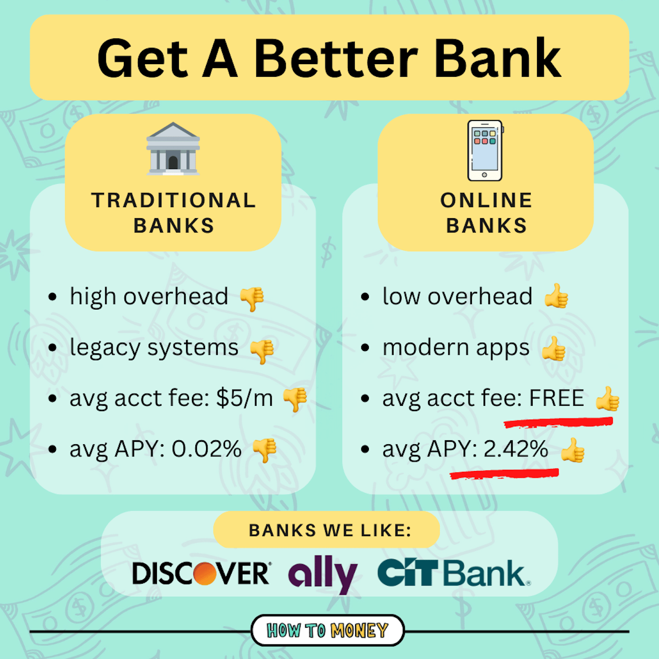 We hope that everyone reading this is utilizing a high-yield savings account, but if youâre not, now is the time to open one! The big banks suck. Do a little bit of research to ensure youâre still getting the best rate and that your money is working hard for you.